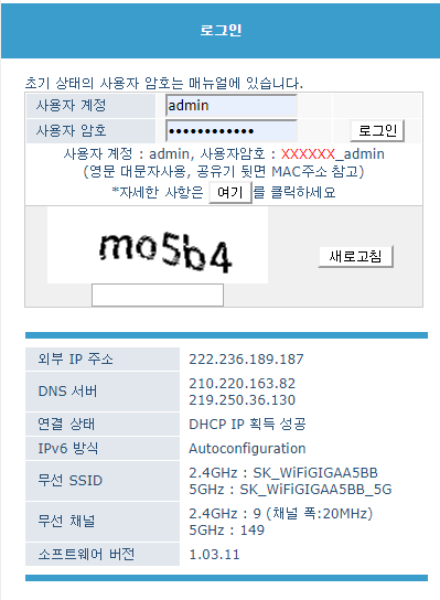 그러면 아래와 같이 공유기 접속 화면이 나옵니다.