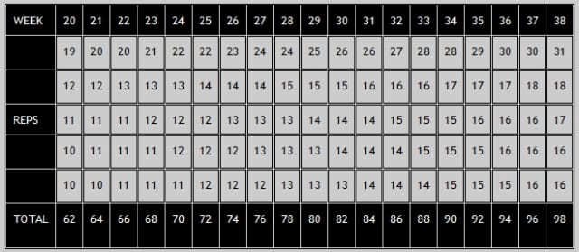 1주차부터 38주차까지 한 번 운동때 정해진 개수만큼의 턱걸이를 5세트를 수행하는 것이다.