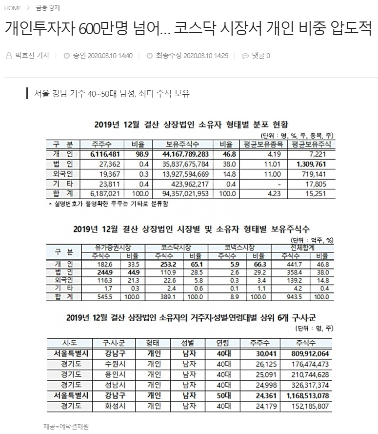 아래 기사에 나오는 예탁결재원 자료에 의하면 국내 주식투자 인구는 610만명 정도가 된다.