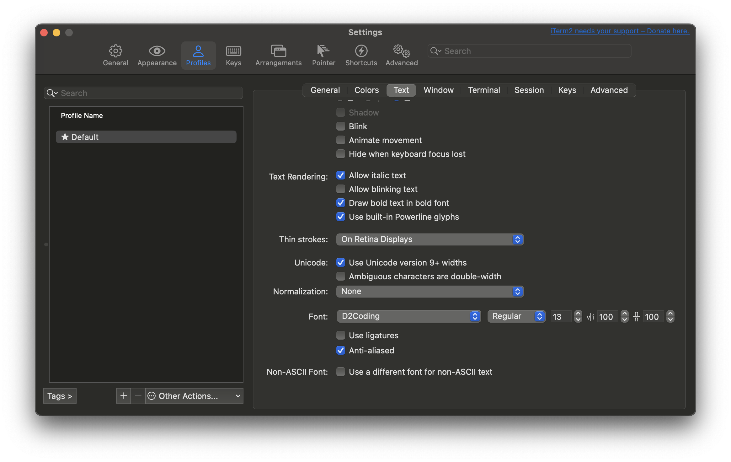 iterm2 에서 설정 Settings>Profile>Text 하단의 Font 에서 설치한 D2Coding 선택