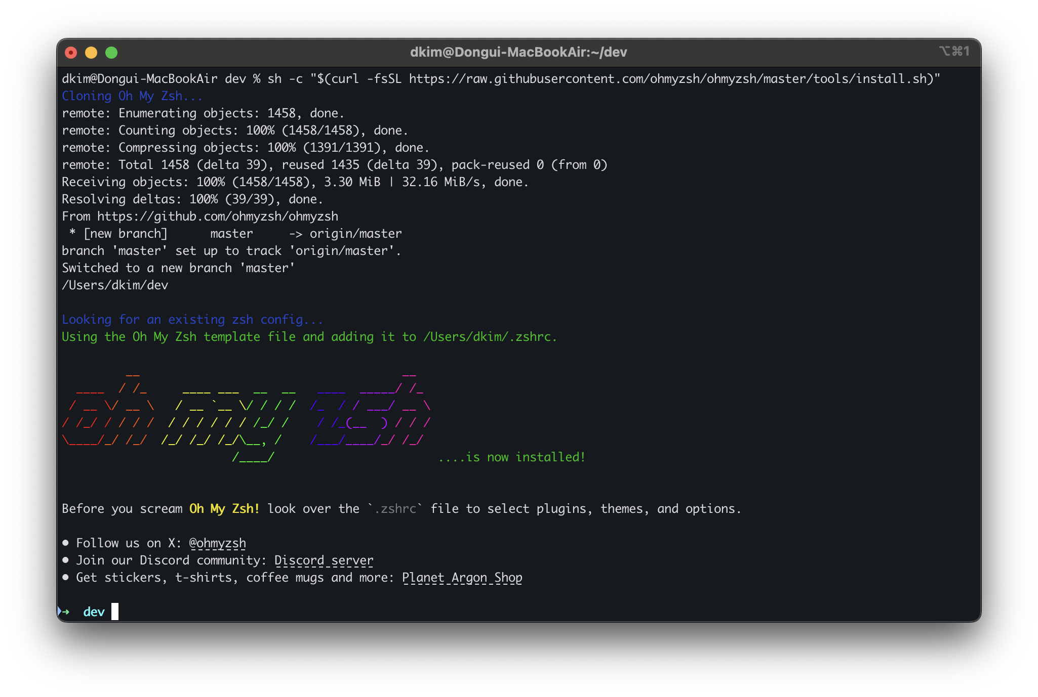 sh -c "$(curl -fsSL https://raw.githubusercontent.com/ohmyzsh/ohmyzsh/master/tools/install.sh)"