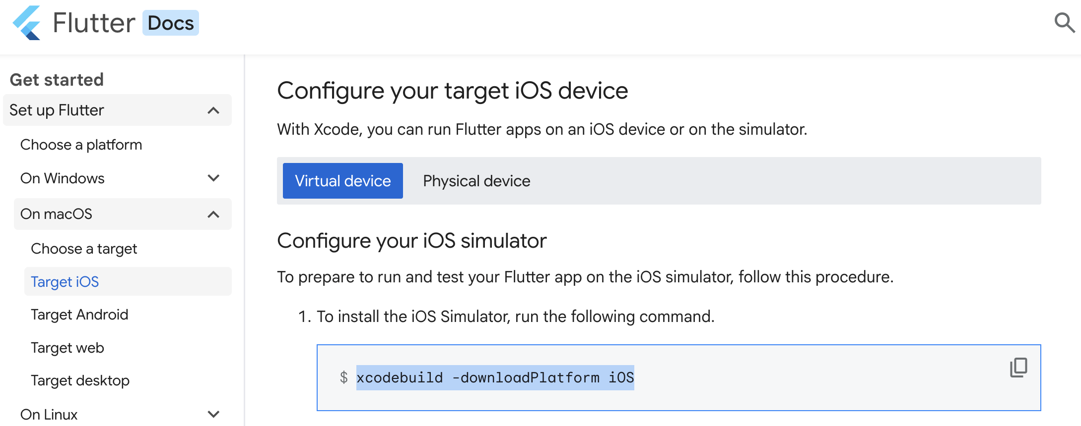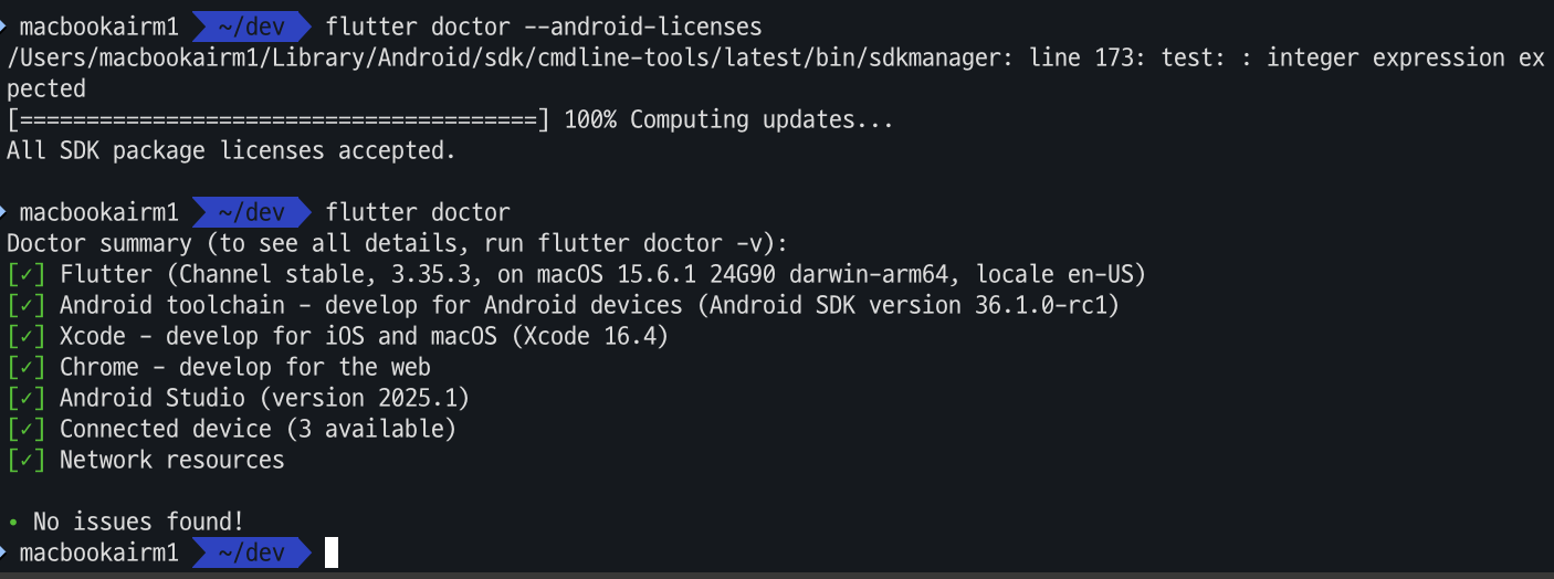 - flutter SDK 설치는 Downlaod & Install 선택해서 애플실리콘용으로 다운받아서 zip을 myusers 폴더에 풀어주고 ~/.zshrc에서 /myusers/flutter/bin 폴더를 패스 걸어줌