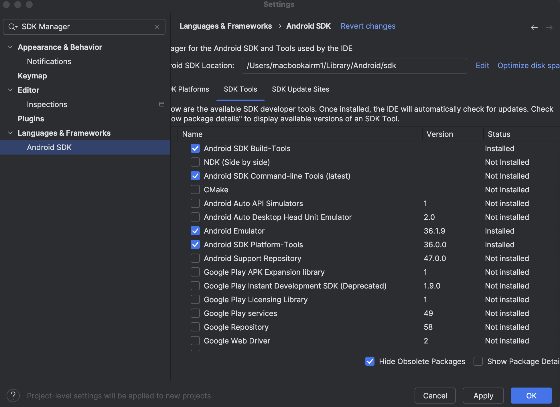 - Flutter doctor 해보면 android studio의 cmd-line tool SDK가 설치안되어있다고 설치하라고 한다.