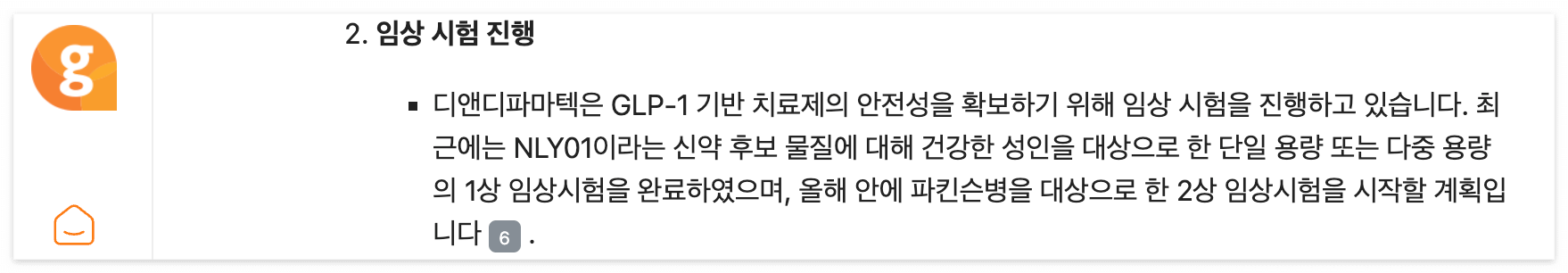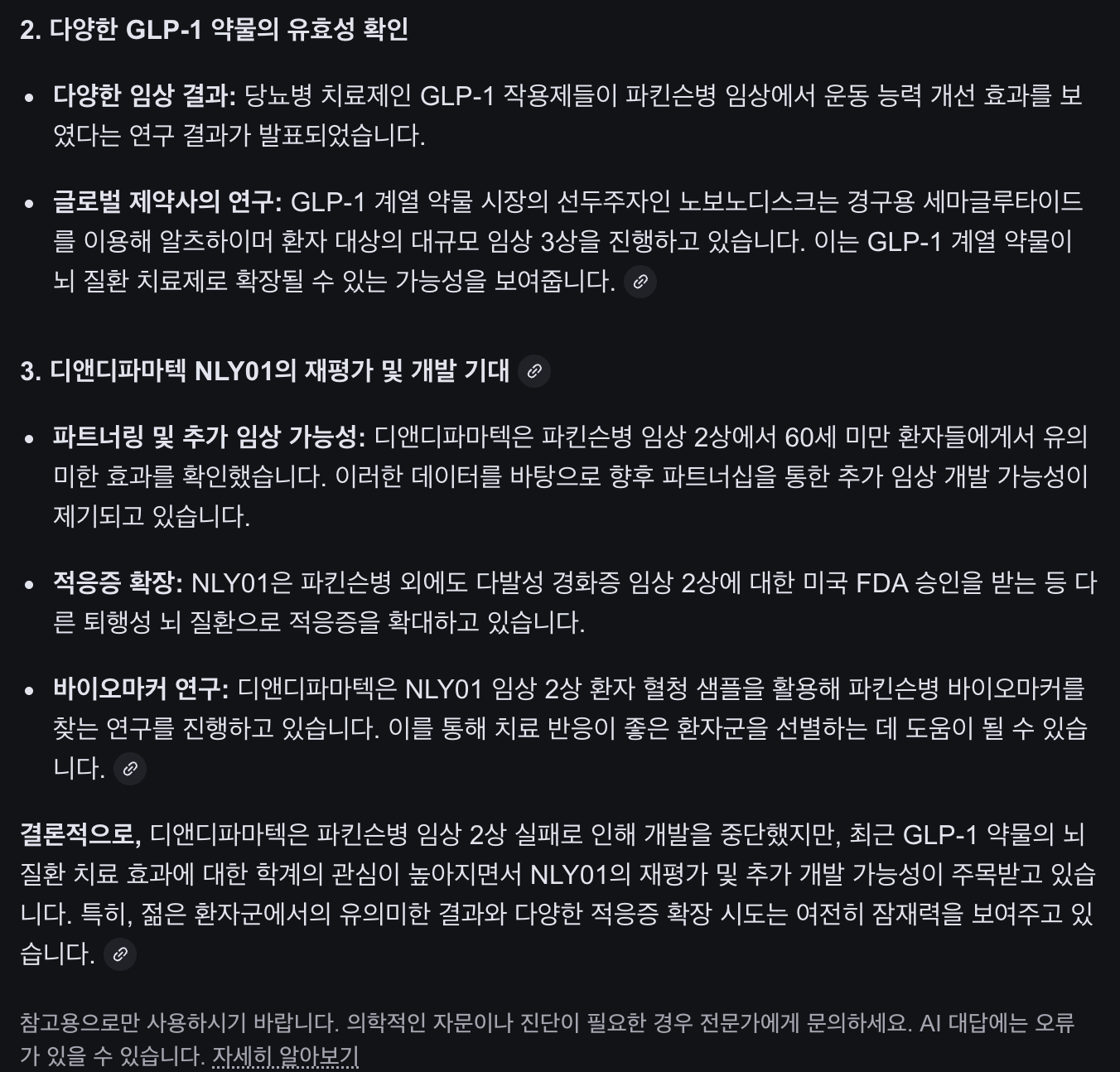 근데 답변중에 최근에 GLP-1 기술의 파킨슨병 치료제 임상2상을 시작한다는데 이건 뭐지. 내가 보고서에서 읽었던거랑은 완전 다른 내용이다.