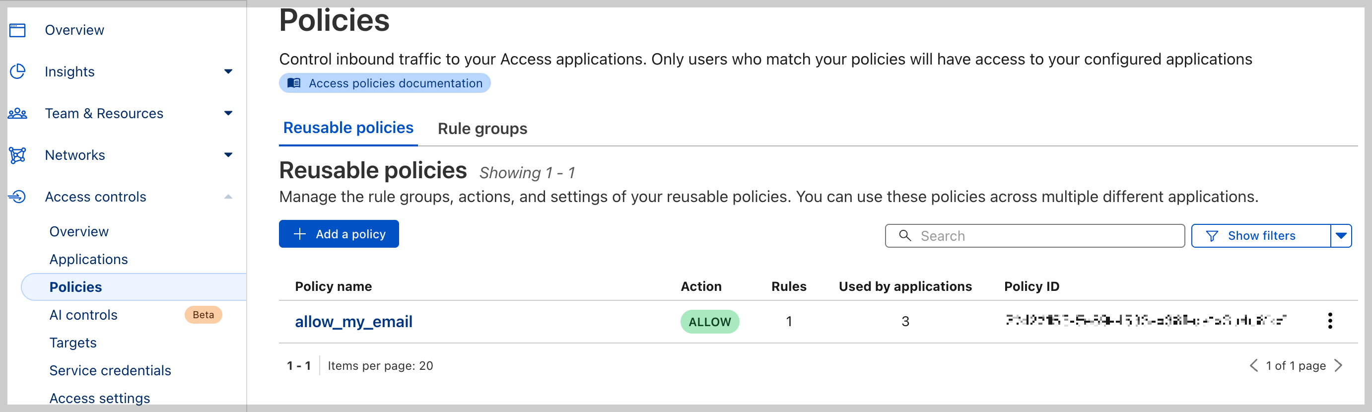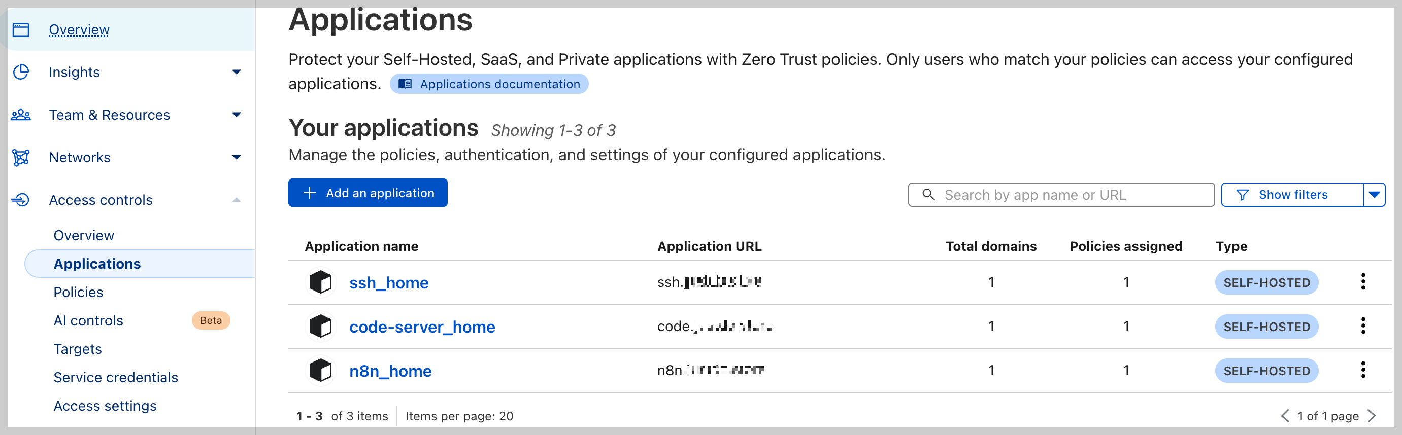 Cloudflare Zero Trust 대시보드 > Access > Applications에서 각 도메인(n8n.mydomain.net 등)에 대한 애플리케이션을 생성하고 정책(Policy)을 설정합니다.