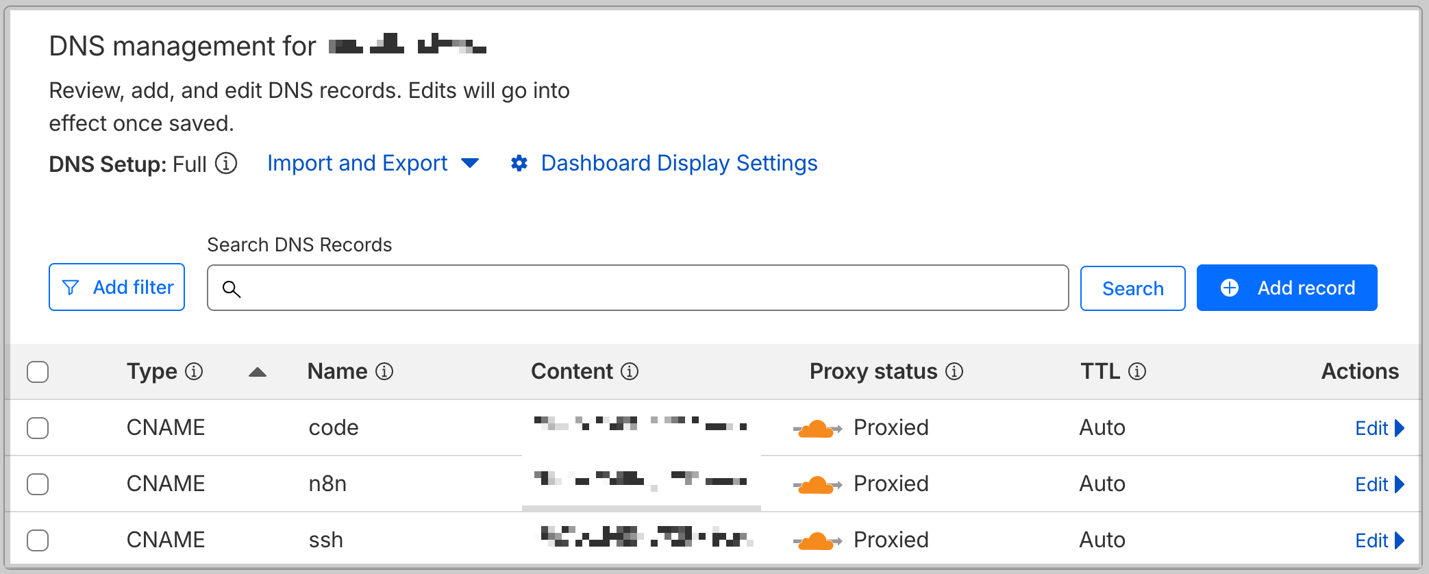명령어 실행이 안 될 경우, Cloudflare 대시보드에서 CNAME 레코드를 수동으로 추가할 수 있습니다.