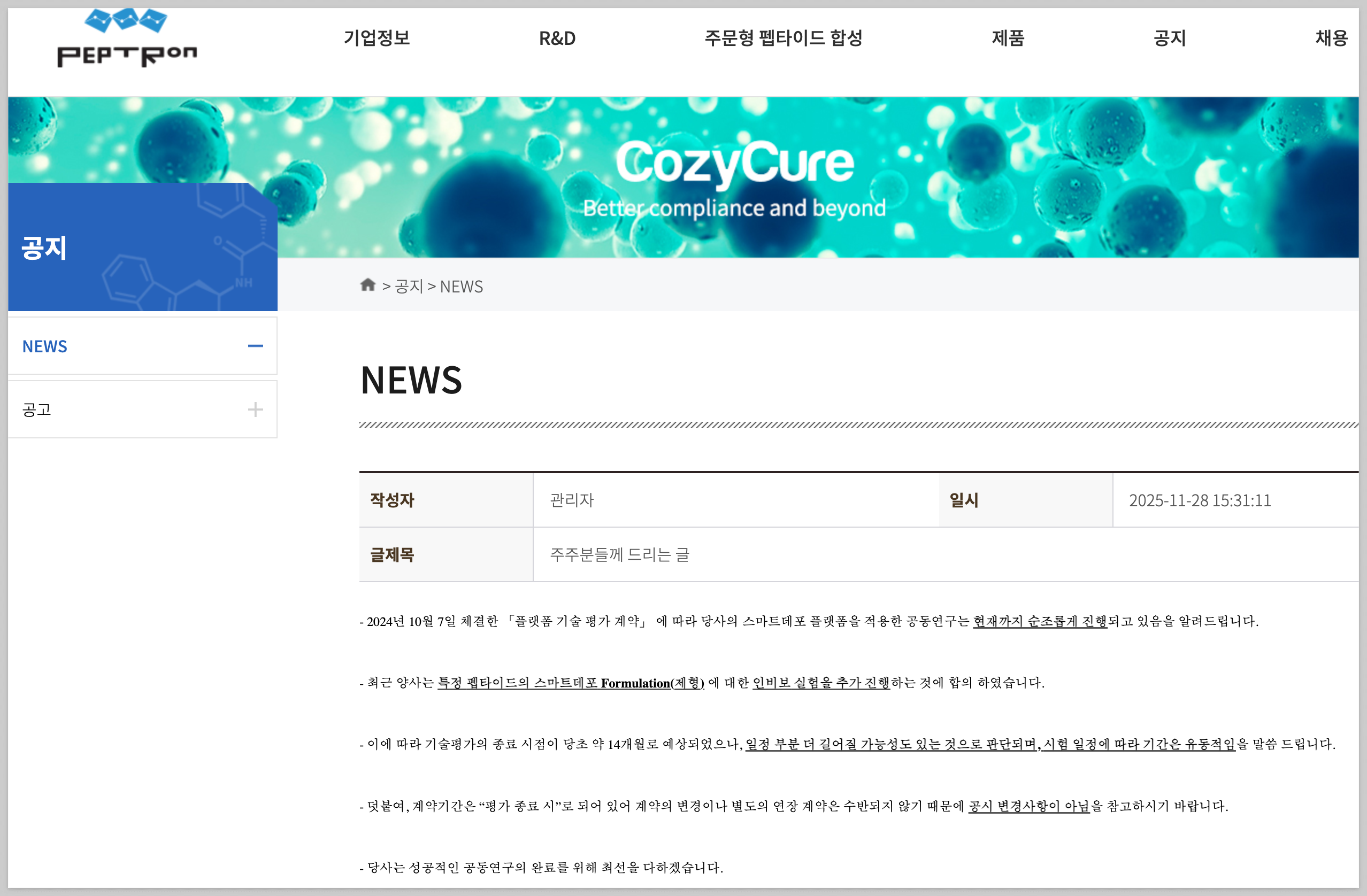 - 2024년 10월 7일 체결한 「플랫폼 기술 평가 계약」 에 따라 당사의 스마트데포 플랫폼을 적용한 공동연구는 현재까지 순조롭게 진행되고 있음을 알려드립니다. - 최근 양사는 특정 펩타이드